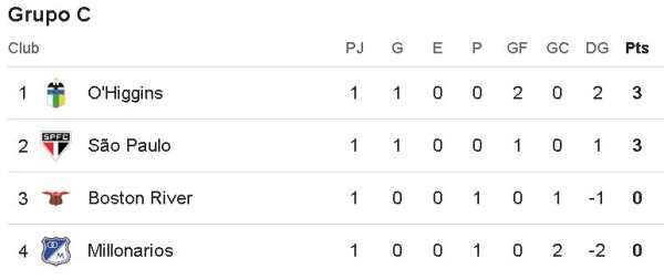 Por otra parte, tras completar la participación de los equipos chilenos en la primera fecha, O'Higgins es líder en el Grupo C, gracias a su victoria 2-0 frente a Millonarios. Sao Paulo también tiene 3 unidades, gracias a su triunfo 1-0 sobre Boston River.