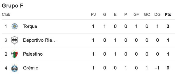 En el Grupo F, Palestino es segundo junto a Deportivo Riestra, luego de empatar 0-0 este miércoles en Argentina. Montevideo City Torque lidera, por su victoria 1-0 ante Gremio.