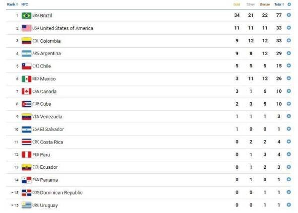 Por su parte, en la cima, Brasil sigue liderando con 77 medallas, y completan el podio EEUU con 33, y Colombia también con 33.