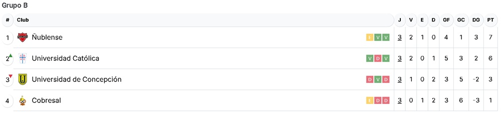 En el B, Ñublense está en el primer lugar con 7 unidades, mientras que Universidad Católica es segundo con 6 puntos.