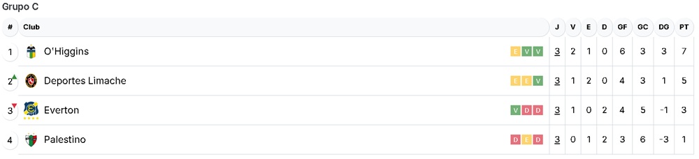 Respecto al Grupo C, O'Higgins es puntero también con 7 puntos, y su escolta es Deportes Limache con 5 unidades.