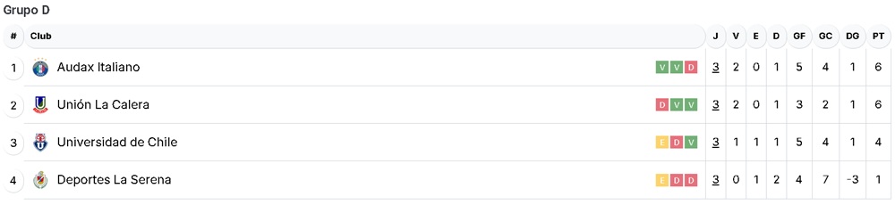 Finalmente, en el D, Audax Italiano y Unión La Calera lideran con 6 puntos, pero el cuadro de colonia tiene mejor diferencia de gol. En este mismo grupo, Universidad de Chile es tercero con 4 unidades.