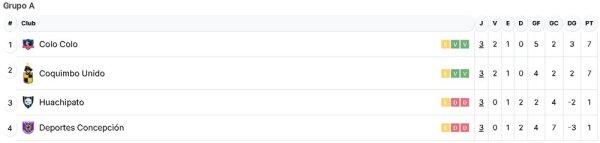 Por un lado, en el Grupo A, Colo Colo es líder con 7 puntos, las mismas unidades que Coquimbo Unido, pero con mejor diferencia de gol.