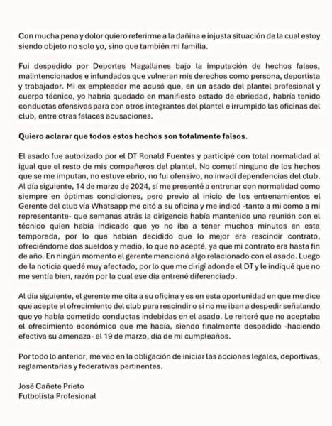“Fui despedido por Deportes Magallanes bajo la imputación de hechos falsos, malintencionados e infundados que vulneran mis derechos como persona, deportista y trabajador”, manifestó Cañete.