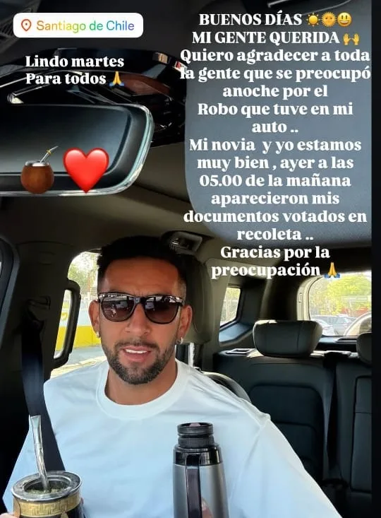 Posteriormente, la mañana de este martes, el bicampeón de América con La Roja subió una historia para actualizar la situación, e indicó que sus documentos aparecieron en la comuna de Recoleta.