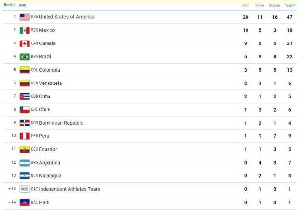 Cerrando este podio, se ubican México, con 10, 5 y 3 preseas respectivamente, y Canadá con 9, 6 y 6.