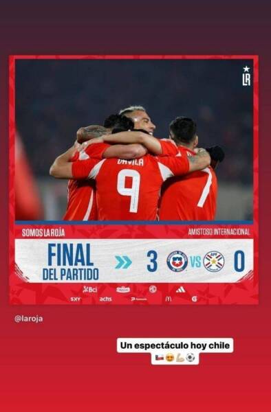 A través de sus historias de Instagram, el “Pitbull” publicó una imagen con el resultado final del encuentro, y manifestó que “un espectáculo hoy Chile”.